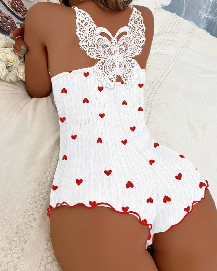 Macacão feminino 2024 primavera moda coração impressão entalhe pescoço manga longa casual magro diário casa shorts pijama macacão